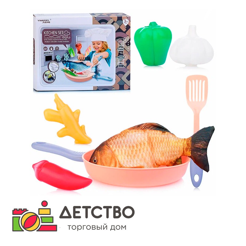 Рыба с мягким наполнителем и реалистичным принтом, внутри механизм для движений хвостом. Соответствует требованиям безопасности продукции. Рыба работает от аккумулятора (USB-кабель для зарядки аккумулятора в комплекте).Комплектация: рыба — 1 шт., сковорода — 1 шт., лопатка — 1 шт., имбирь — 1 шт., перцы — 2 шт., чеснок — 1 шт.