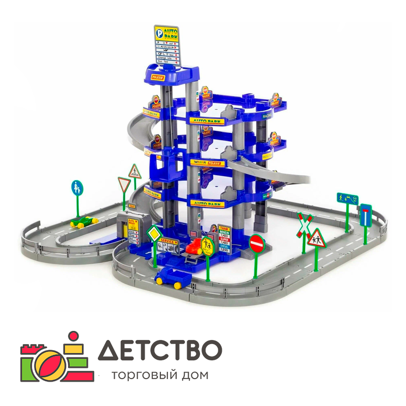Красивый четырехуровневый паркинг с тремя мини-автомобилями, дорогой и дорожными знаками. На первом уровне паркинга расположены автомойка, автозаправка, автосервис с эстакадой. На остальные уровни автомобили поднимаются на лифте с ручным приводом, то есть для движения лифта ребёнку нужно поворачивать рукоятку на верхнем уровне.Соответствует требованиям безопасности продукции. Для детей от 5 лет.