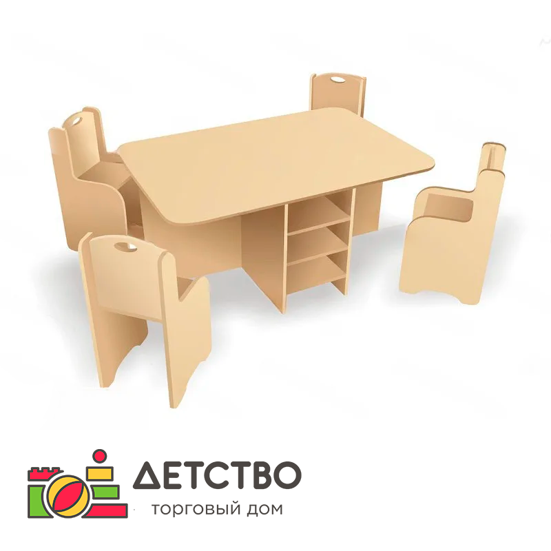 Игровой ландшафтный стол предназначен для проведения настольных игр, моделирования различных ситуаций и наглядного пояснения детям тех или иных тем. Использование стола помогает работать над сюжетно-ролевыми моделями, разбирать задачи, конструировать, заниматься творчеством.Комплект выполнен из ламинированной ДСП, натурального светлого оттенка. Кромка прочная, противоударная. Нижняя часть стола поделена на 4 отсека, таким образом, чтобы сидящие не мешали друг другу. Также в столе имеются полочки для хранения. Стульчики для детей удобные, устойчивые с широким сидением и спинкой.