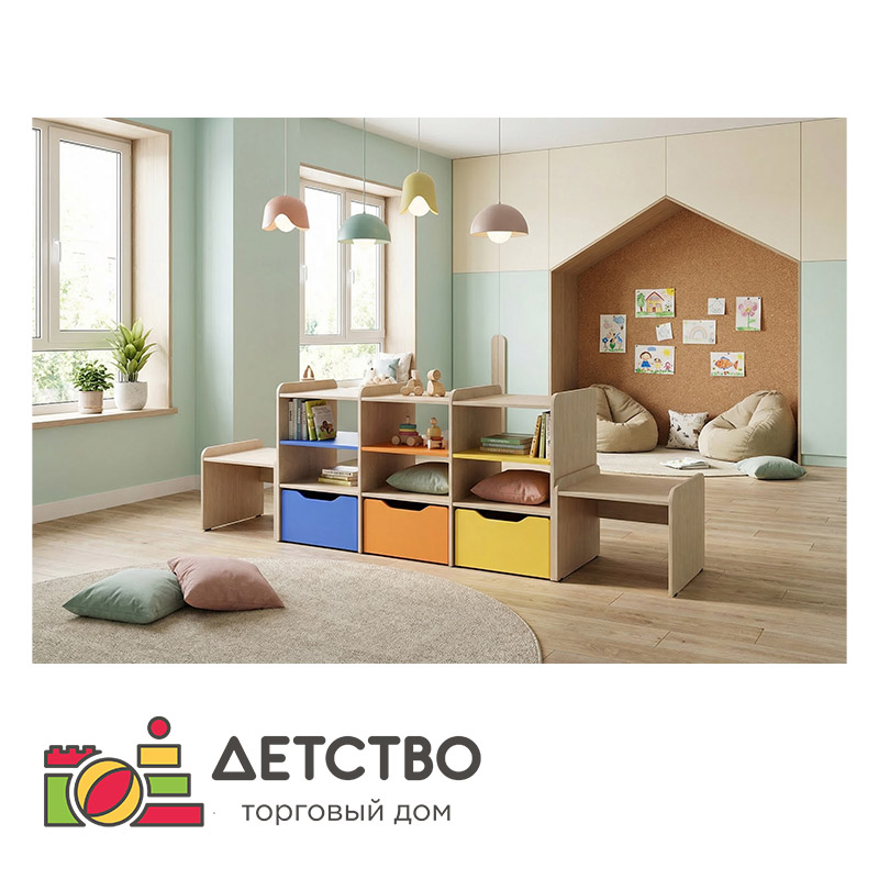 Выполнен в контрастных цветах. Внешние контуры имеют безопасные скругленные углы для предотвращения травмирования ребенка. Материал ЛДСП 16 мм, кромка ПВХ открытых видимых граней толщиной 2 мм.ОСНОВНЫЕ ХАРАКТЕРИСТИКИ