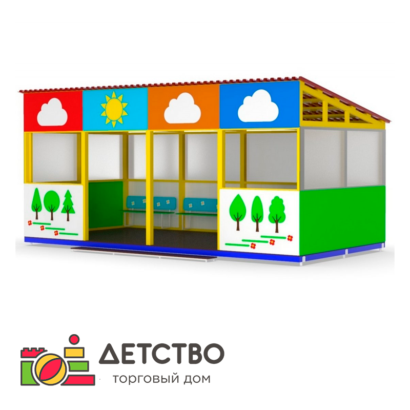 Веранда "Новый лес" предназначена для размещения и эксплуатации в общественных местах и учреждениях с целью организации досуга и развития детей. Может эксплуатироваться круглогодично во всех климатических зонах. Веранда представляет собой сборно-разборную конструкцию с повышенными свойствами по водо- и износостойкости, с антискользящим покрытием. Изделие устанавливается в заранее подготовленные отверстия глубиной 0,5 м и заливается бетоном. Изделие поставляется в разобранном и упакованном виде.Материалы: опоры — брус из хвойных пород 100 х 100 мм; стеновой модуль — фанера типа ФСФ, кромки фанеры шлифованы и закруглены, изображение на декоративные элементы наносится методом ультрафиолетовой (УФ) печати; настил пола — фанера типа FW с антискользящим покрытием, кромки фанеры шлифованы и закруглены; настил крыши — профилированный лист; декоративные элементы — фанера типа ФСФ; кромки фанеры шлифованы и закруглены; фурнитура — крепёж оцинкованный, заглушки пластиковые.