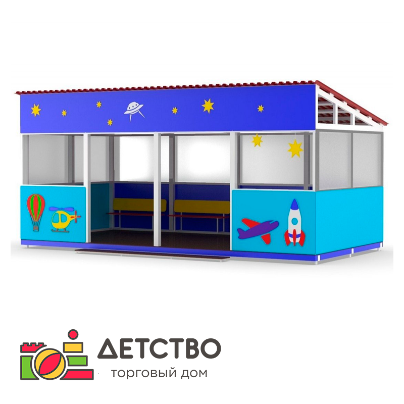 Веранда "Полёт" предназначена для размещения и эксплуатации в общественных местах и учреждениях с целью организации досуга и развития детей. Может эксплуатироваться круглогодично во всех климатических зонах. Изделие представляет собой сборно-разборную конструкцию с повышенными свойствами по водо- и износостойкости, с антискользящим покрытием. Изделие устанавливается в заранее подготовленные отверстия глубиной 0,5 м и заливается бетоном. Изделие поставляется в разобранном и упакованном виде.Материалы: опоры — брус из хвойных пород 100 х 100 мм; стеновой модуль — фанера типа ФСФ, кромки фанеры шлифованы и закруглены, изображение на декоративные элементы наносится методом ультрафиолетовой (УФ) печати; настил пола — фанера типа FW с антискользящим покрытием, кромки фанеры шлифованы и закруглены; настил крыши — профилированный лист; сиденье — фанера типа ФСФ, кромки фанеры шлифованы и закруглены; декоративные элементы — фанера типа ФСФ, кромки фанеры шлифованы и закруглены; фурнитура — крепёж оцинкованный; заглушки пластиковые.