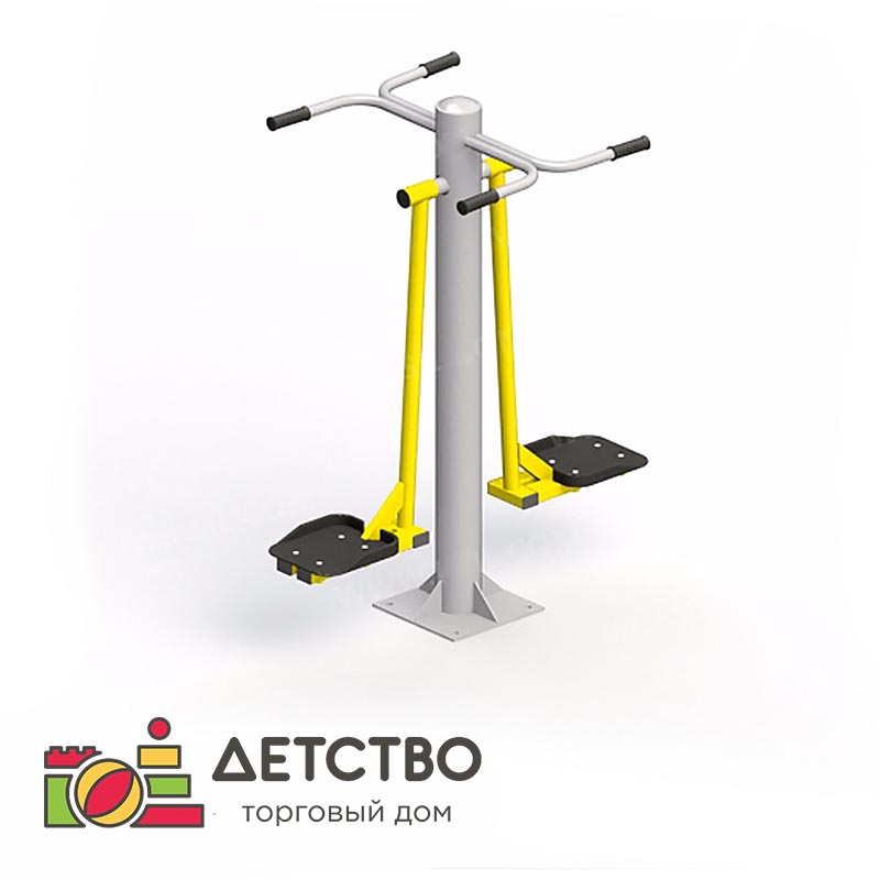 Тренажер бокового раскачивания предназначен для тренировки и укрепления мышц и суставов талии и ног, развивает координацию движений. Рассчитан на двух человека, возрастная группа: от 14 летНесущая стойка тренажера выполнена из металлической трубы сечением Ø не менее 133 мм с толщиной стенки не менее 5 мм на металлическом постаменте с отверстиями для крепления к фундаменту, сверху стойка заварена металлической пластиной. Все шарнирные узлы имеют подшипники скольжения закрытого типа. Опоры для ног изготовлены из ударопрочного и морозостойкого пластика. Захваты для рук имеют рукоятки, выполненные из атмосферостойкой резины.