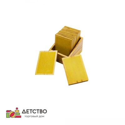 В комплект входят: деревянный ящик с 5-ю парами табличек из сосны с различной степенью шероховатости.Ребёнок должен найти одинаковые по шероховатости пары табличек на ощупь.