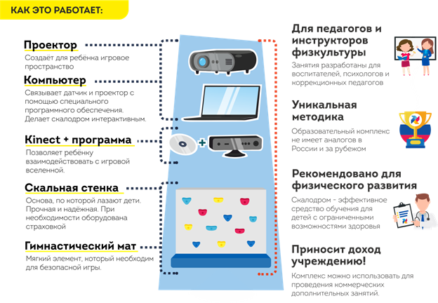Интерактивный скалодром – обучающая игровая система, которая объединяет в себе инновационные технологии, образовательные задачи и физическую активность.Интерактивный скалодром – стена, оборудованная выступами для лазания и меняющая свой дизайн в зависимости от выбора игры. Это новая обучающая система, которая объединяет в себе инновационные технологии, образовательные задачи и физическую активность.