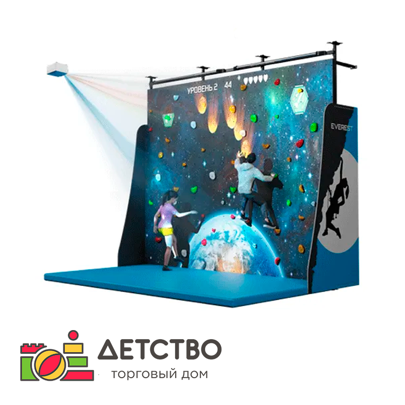 Скалодром "Эверест" состоит из 6 основных частей: скальной стены, гимнастического мата, компьютера, проектора, датчика и программного обеспечения. Интерактивный скалодром Эверест подходит для ДОУ, школ, спортивных, развивающих и развлекательных центров. Эверест способствует развитию детей в процессе движения, приобщает к активному образу жизни, способствует внутреннему воспитанию — ментальному, волевому, нравственному. Развивает психофизические качества: ловкость, гибкость, баланс, выносливость и координацию. «Эверест» учит подбирать маршрут, разрабатывать восхождение логически, бороться со страхами и принимать собственные решения.Скальная стена поставляется в двух вариантах: с металлическим каркасом (независимый скалодром) и с деревянным предкаркасом (крепится к стене). Размер проекции на стене — 8,9 кв. м (2,5 х 3,6). Возможно уменьшить или увеличить площадь комплекса — расчёт зависит от особенностей помещения.
