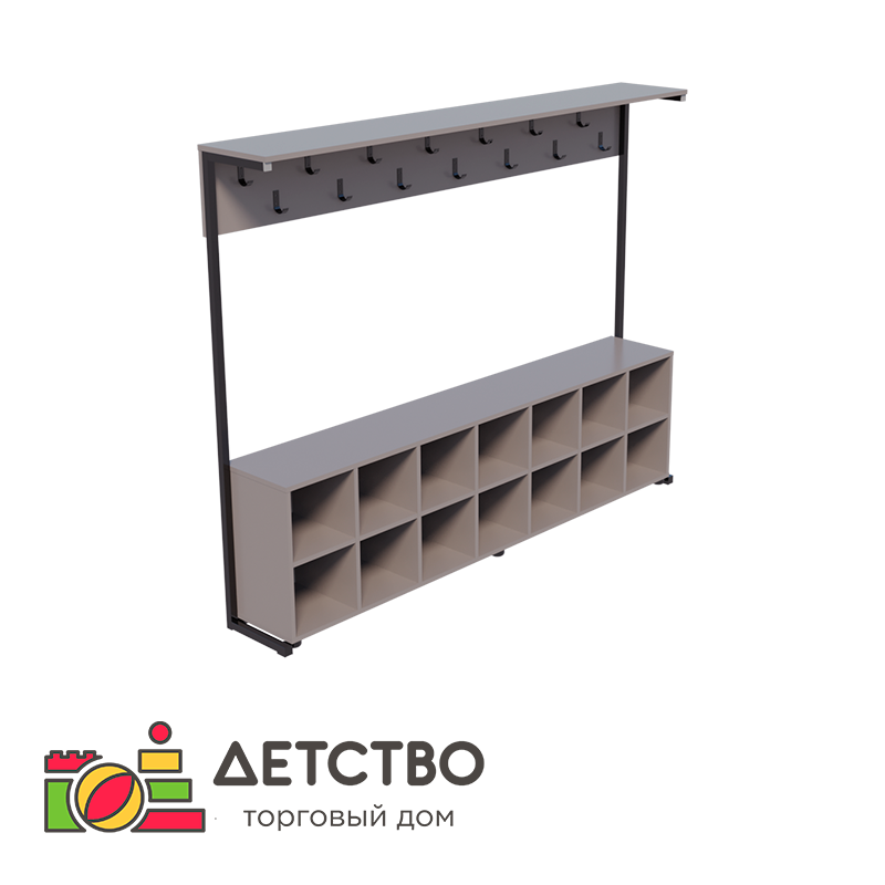 - Напольная гардеробная вешалка предлагает рациональное решение для оптимизации пространства для целой группы воспитанников. Конструкция включает 28 однорожковых крючков и открытых отделений для хранения обуви или аксессуаров. Такой формат способствует формированию у детей бережного отношения к вещам без жесткого зонирования. Модель оснащена регулируемыми опорами для устойчивости на любом покрытии. Прочные материалы гарантируют сохранность внешнего вида при интенсивной эксплуатации. При значительной вместимости вешалка сохраняет компактность за счет двустороннего доступа и позволяет организовать систему хранения даже в ограниченном помещении.