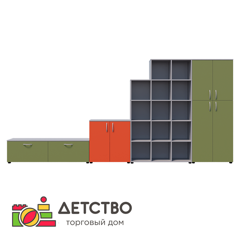 Современный 4-х модульный набор специально разработан для детских садов, школ и развивающих центров. Включает все необходимое для удобного хранения игрушек, учебных материалов и методических пособий.