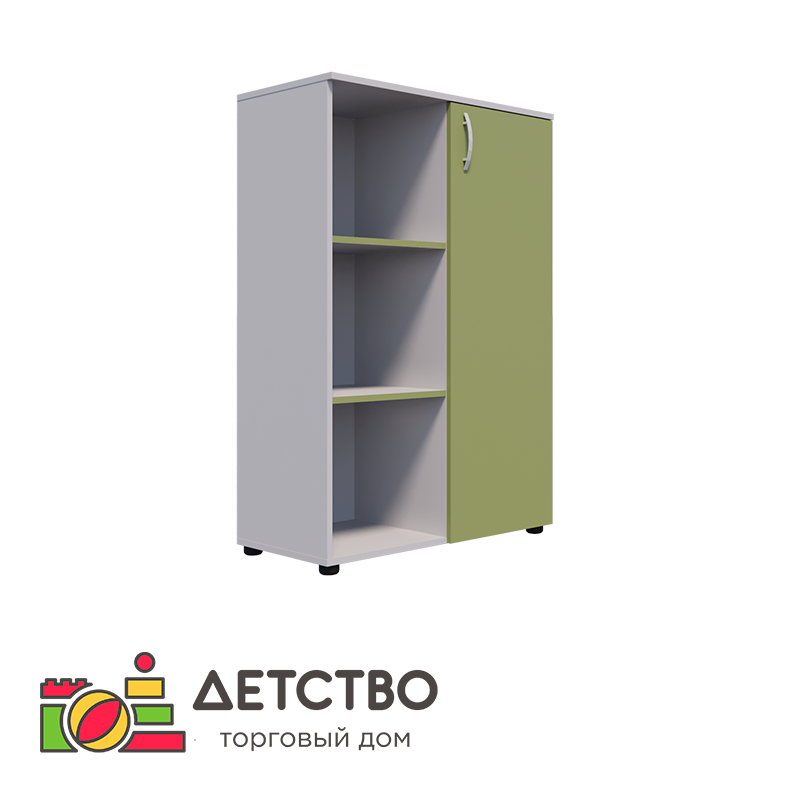 Шкаф стеллаж с открытыми полками и дверцей для детского сада