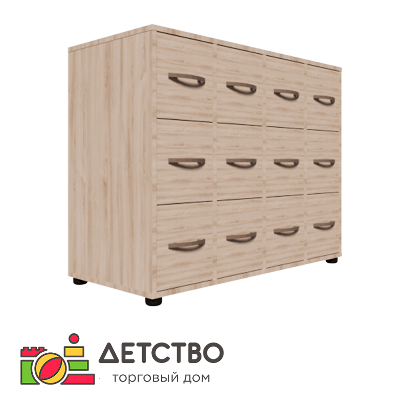 Этот шкаф предназначен для хранения формуляров и других документов. Двенадцать выдвижных ящиков оснащены ручками-скобами и шариковыми направляющими, а сзади они закрыты стенкой из ХДФ. Сам шкаф сделан из плотного ЛДСП и поставлен на регулируемые опоры, с помощью которых изделие можно расположить на неровном полу, а также отрегулировать по высоте.