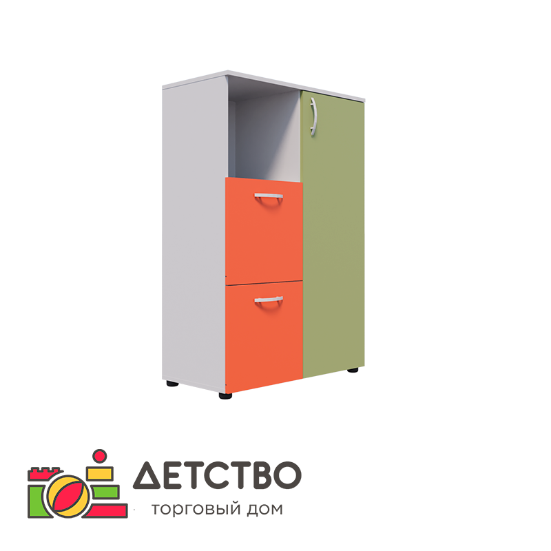Шкаф покрашен в весёлые, но при этом приглушённые цвета: оранжевый и зелёный, а ручка-скоба — металлическая. Изделие стоит на регулируемых опорах: вы сможете скорректировать высоту и положение на полу. У выдвижных шкафчиков есть шариковые направляющие, которые сделают процесс использования простым и плавным.