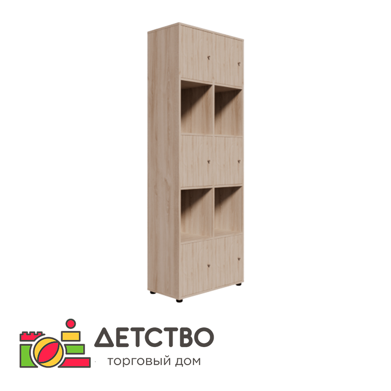 - Отделения: Всего 10 ячеек — 6 закрытых одностворчатыми дверцами для надежного хранения и 4 открытых отделения для удобного доступа и демонстрации.