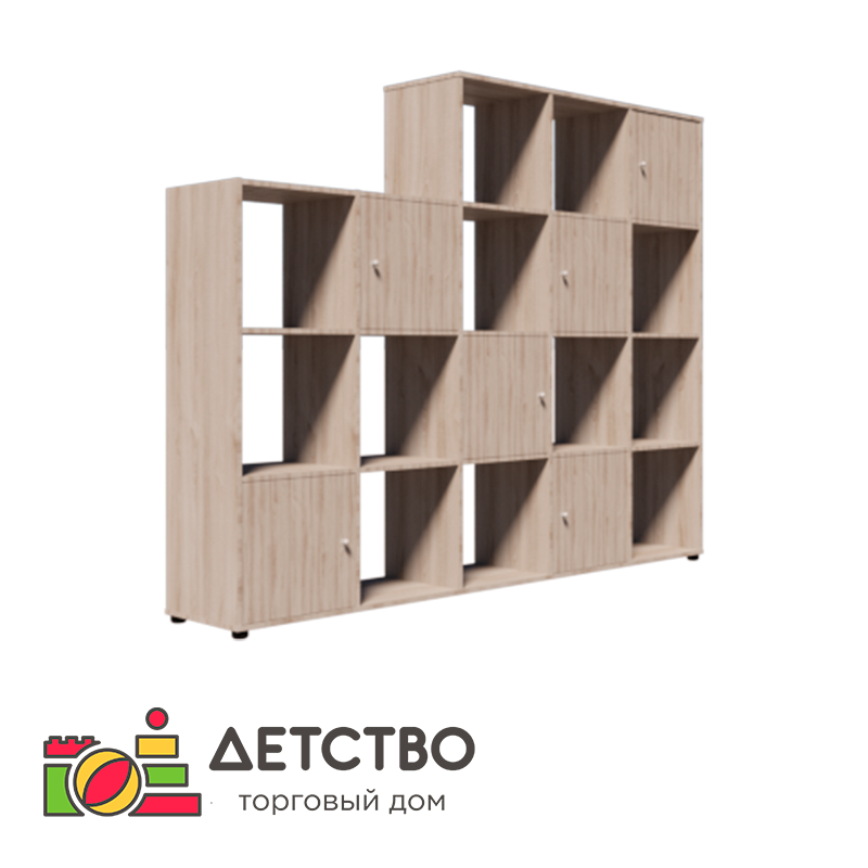 Этот стеллаж можно использовать для хранения документации, пособий, детских игрушек, инвентаря, техники, логопедического оборудования и многого другого. Его особенность в наличии как открытых, так и закрытых отделений. Благодаря этому стеллаж выглядит очень интересно и заметно, он отлично украсит любое помещение ДОУ, особенно если его изготовить в каком-нибудь ярком цвете — для этого обращайтесь к менеджерам.Комплектация: стеллаж — 1 шт., отделения — 18 шт., дверцы — 6 шт., ручки-кнопки — 6 шт., задние стенки — 6 шт., регулируемые опоры — 4 шт.