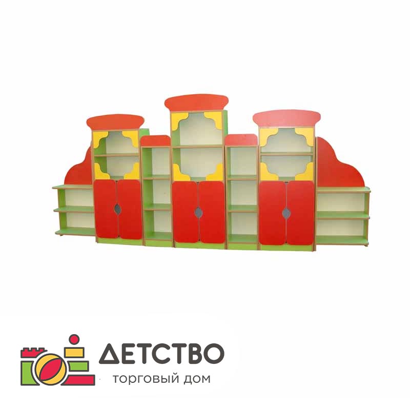 Яркая стенка размерами 3100×300×1400 мм создает удобную систему хранения. Полки над тумбами и по бокам предназначены для хранения часто используемых игрушек и материалов. Полукруглые козырьки в верхней части не только украшают конструкцию, но и защищают полки от пыли. Низкая высота (1400 мм) и отсутствие острых углов обеспечивают безопасность для детей ясельного возраста. Стенка помогает приучать детей к порядку с раннего возраста — после игры малыши с удовольствием складывают игрушки в «домик-грибок». Данная модель отлично подойдёт для детских садов, в частности для детей ясельной группы.✤ Стенка имеет три вместительные тумбы с дверцами, ручки которых заменяют полукруглые вырезы, над тумбами и по бокам расположены полочки.