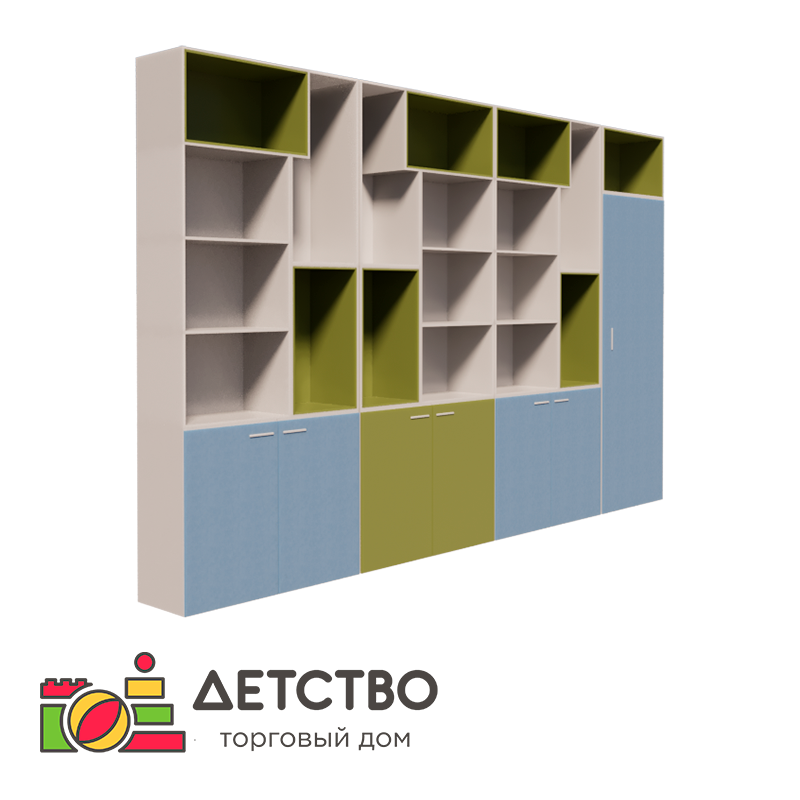 Идеально для оснащения игровых комнат, методических кабинетов, учебных классов и детских садов! Многофункциональная конструкция размерами 3000×450×1990 мм состоит из четырех модулей, образующих единую композицию. Сочетание открытых полок и закрытых секций позволяет рационально распределить материалы: учебные пособия размещаются в открытом доступе, а ценный методический фонд сохраняется за дверцами. Прочное исполнение из ЛДСП 16 мм с защитной кромкой обеспечивает долговечность в условиях ежедневного использования. Регулируемые опоры гарантируют устойчивость на любом покрытии, а хромированные ручки-скобы выдерживают интенсивную эксплуатацию