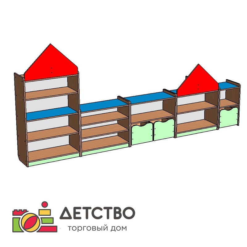 Большая стенка для комплектации групповых помещений детского сада и других учреждений. Подходит для хранения игрушек, книжек, раскрасок, спортивной атрибутики и пр. Малыши могут самостоятельно убирать вещи после игр, чтобы научится самостоятельности, дисциплине и ответственности.
