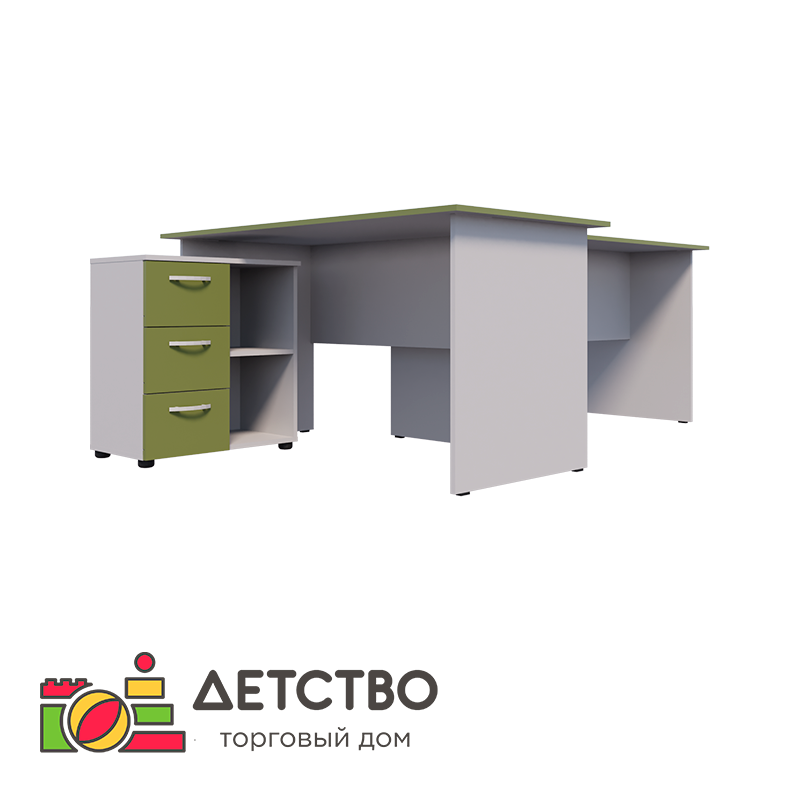 Перед вами комплект мебели, созданный специально для директора детского сада. Во-первых, тут есть просторный стол длиной 140 сантиметров, на который можно поставить компьютер, системный блок, клавиатуру и мышку для работы. Во-вторых, дополнительный приставной столик, расширяющий рабочее пространство. На нём можно подписывать документы или использовать для переговоров с родителями. В-третьих, ко всему этому прилагается вместительная тумбочка, с левой стороны которой находится три выдвижных ящика, а с правой — два открытых отделения.Комплектация: столешницы — 2 шт., тумба — 1 шт., ящики — 3 шт., полка — 1 шт., ручки-скобы — 3 шт., шариковые направляющие — 6 шт., регулируемые опоры — 4 шт., задние стенки — 2 шт., боковые опоры — 4 шт., подпятники — 8 шт.