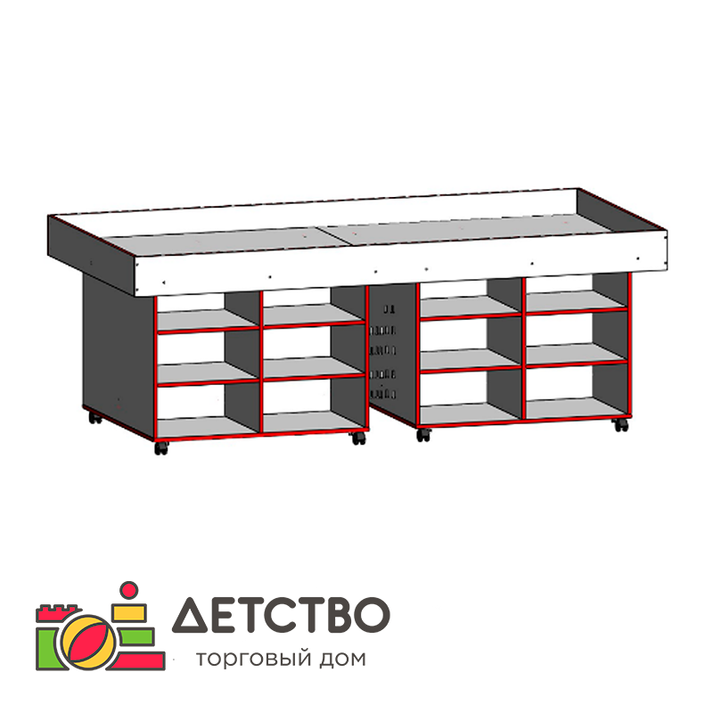 Стол для конструирования и робототехники для кабинета робототехники должен быть большим, ведь во время этих занятий используется большое количество оборудования — ноутбук, конструктор, движки и провода. Длина этого стола — целых 2 метра 43 сантиметра! Также у этого изделия имеется 12 полок размером 30 на 42 сантиметра (высота между полками — 23 сантиметра), в которых можно хранить робототехнические наборы и детали. Бортики стола можно переворачивать, тем самым меняя их высоту с 5 см до 11 см.